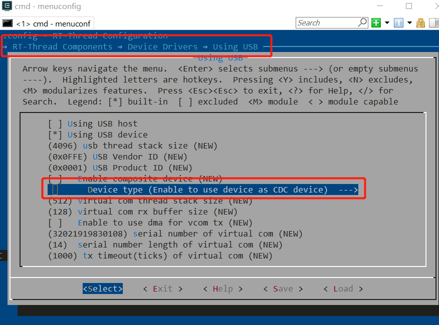 Step 2: Enable USB Device Driver and enable to use device as CDC device.