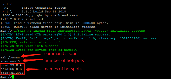The following code will show a WiFi sync scan, and then print the results on the terminal. First perform WIFI initialization, and then execute the WIFI scan function rt_wlan_scan_sync, this function is synchronous, the number of scans and results returned by the function. In this example, the scanned hotspot name will be printed.