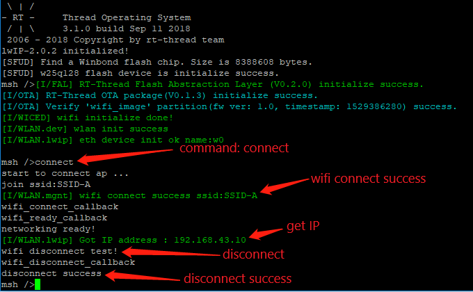 An example of using the wifi connection command is as follows. After the connection is successful, the obtained IP address will be printed on the terminal as follows: