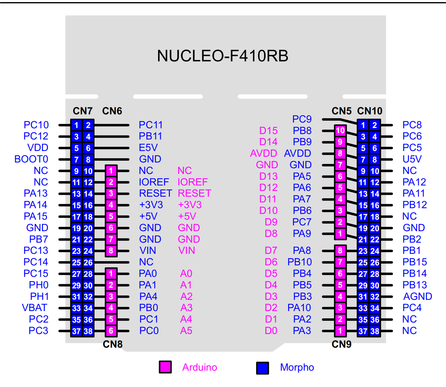STM32F410 Nucleo板的I2C总线是板上丝印的 SCL/D15 和 SDA/D14 引脚,这两个引脚是被RT-Thread I2C设备框架接管的,不需要直接操控这两个引脚,直接引用#include <Wire.h>(Arduino官方I2C头文件)即可使用。