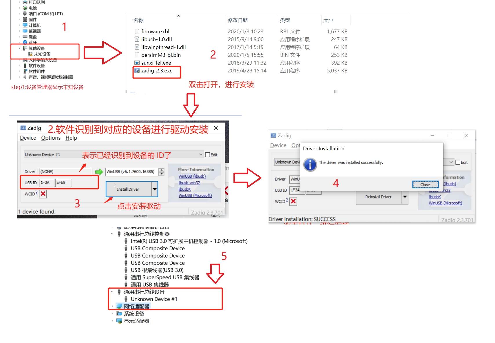 解压tools目录下fel驱动安装.zip文件。参照如下所示的“驱动安装示意图”,安装fel驱动。