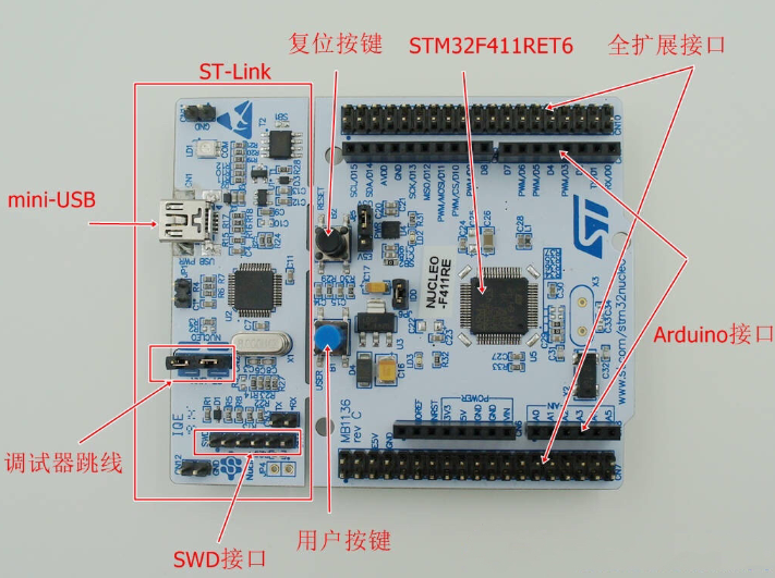开发板更多详细信息请参考意法半导体 STM32F411-Nucleo-64 开发板介绍。