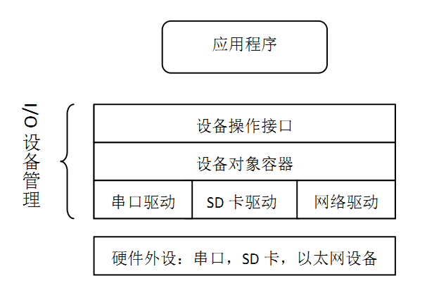 在 RT-Thread 实时操作系统中,各种各样的设备驱动是通过一套 I/O 设备管理框架来管理的。设备管理框架给上层应用提供了一套标准的设备操作 API,开发者通过调用这些标准设备操作 API,可以高效地完成和底层硬件外设的交互。设备管理框架的结构如下图所示: