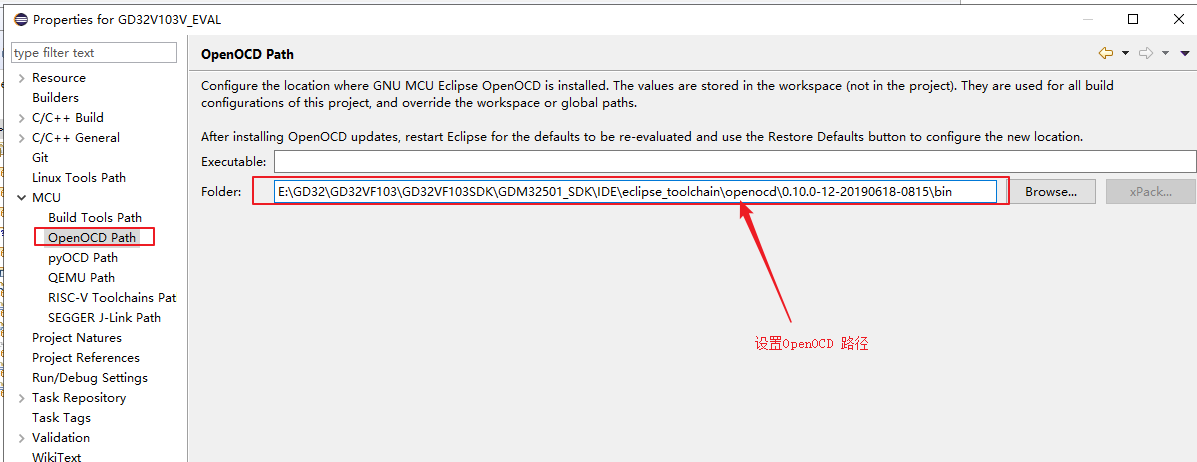 点击 MCU 列表中的 OpenOCD Path 选项,为其选择 SDK 文件包中提供的对应工具。