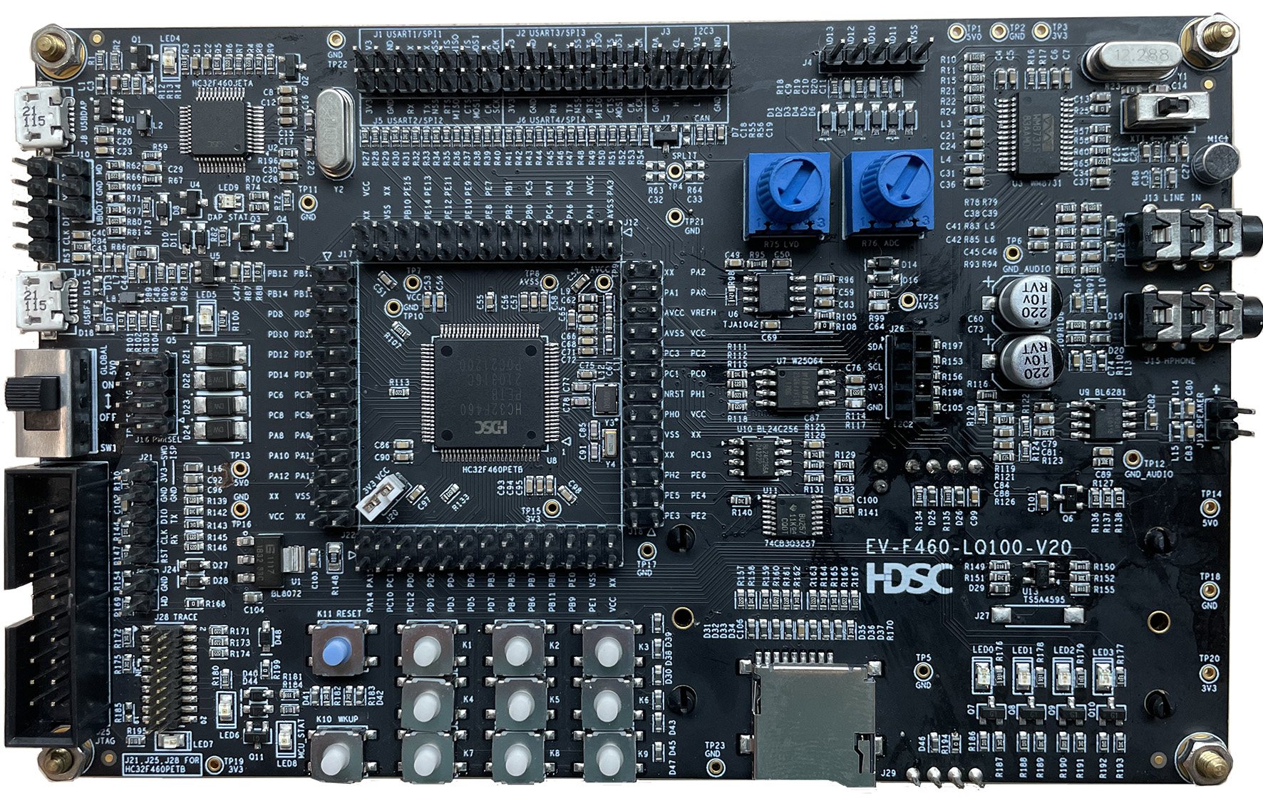 EV_F460_LQ100_V2 是 XHSC 官方推出的开发板,搭载 HC32F460PETB 芯片,基于 ARM Cortex-M4 内核,最高主频 200 MHz,具有丰富的板载资源,可以充分发挥 HC32F460PETB 的芯片性能。