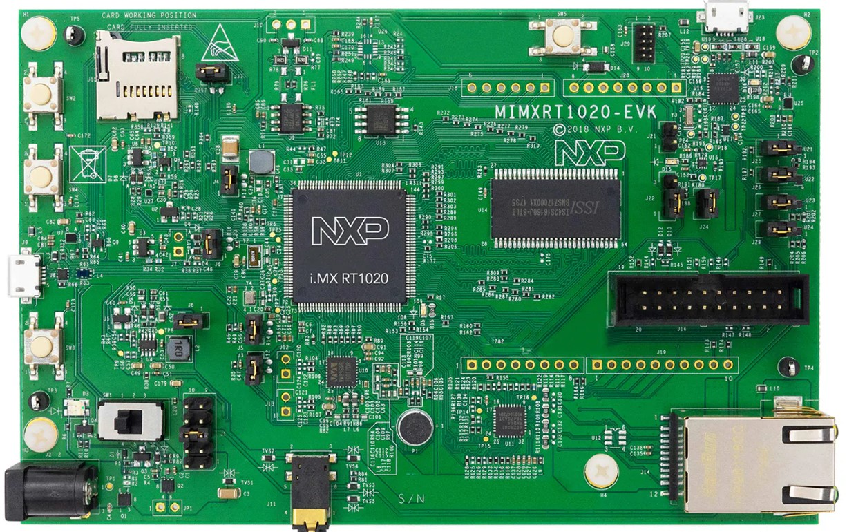 The i.MX RT1020 EVK is a 2-layer low-cost through-hole USB-powered PCB. At its heart lies the i.MX RT1020 crossover MCU in LQFP144 package, featuring NXP’s advanced implementation of the Arm® Cortex®-M7 core. This core operates at speeds up to 500 MHz to provide high CPU performance and excellent real-time response.