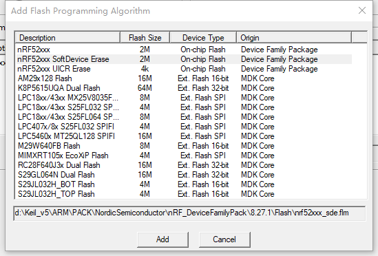 下面提供一种擦写softdevice的方法。在keil中选择softdevice Erase的FLASH算法,这个时候就烧写之前可以擦除之前的softdevice。
