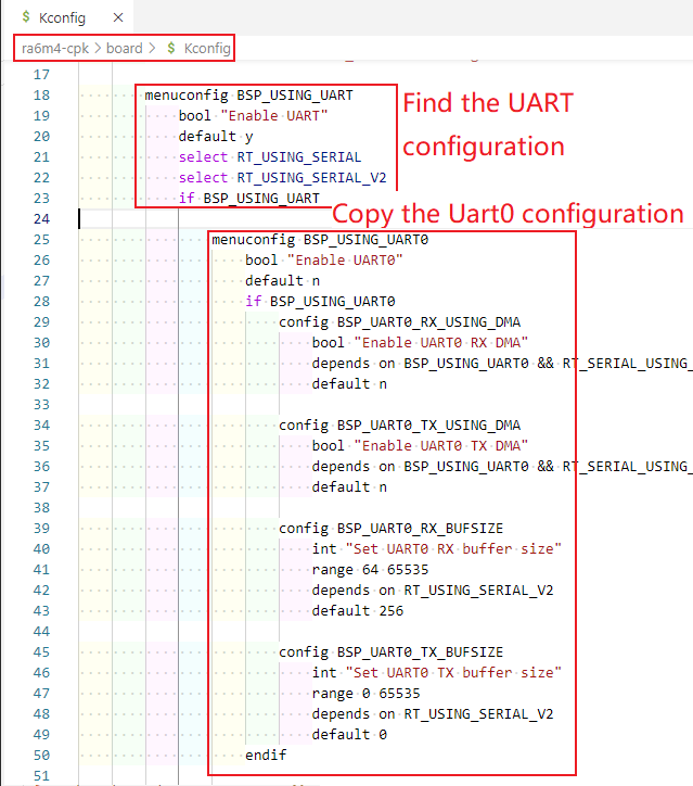 Open the file libraries\HAL_Drivers\config\ra6m4\uart_config.h to add the UART9 configuration.