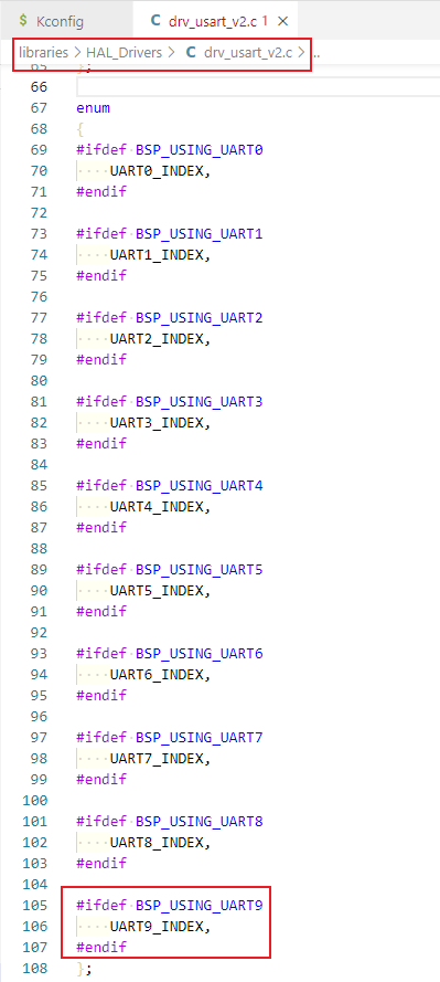 Open the board\kconfig file in the BSP and add the UART9 configuration.