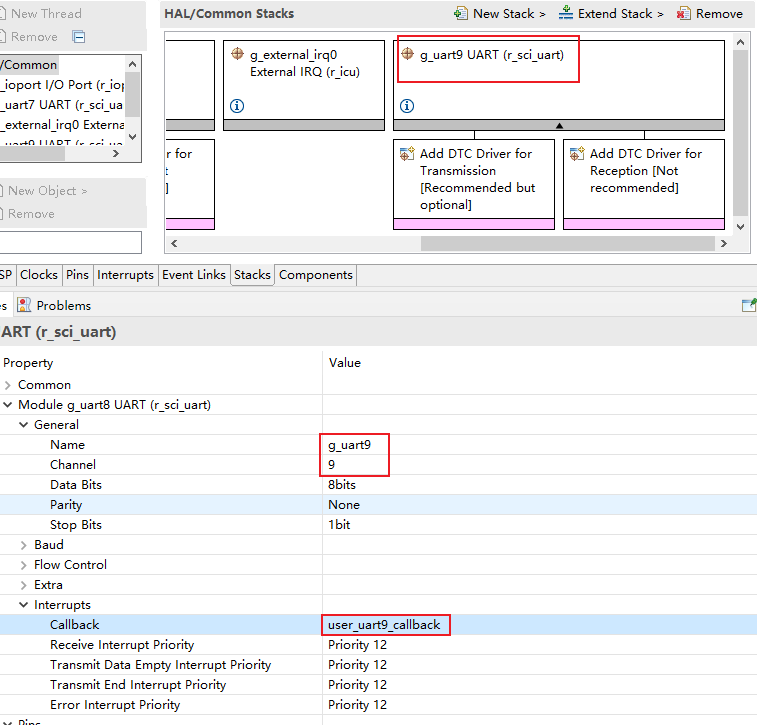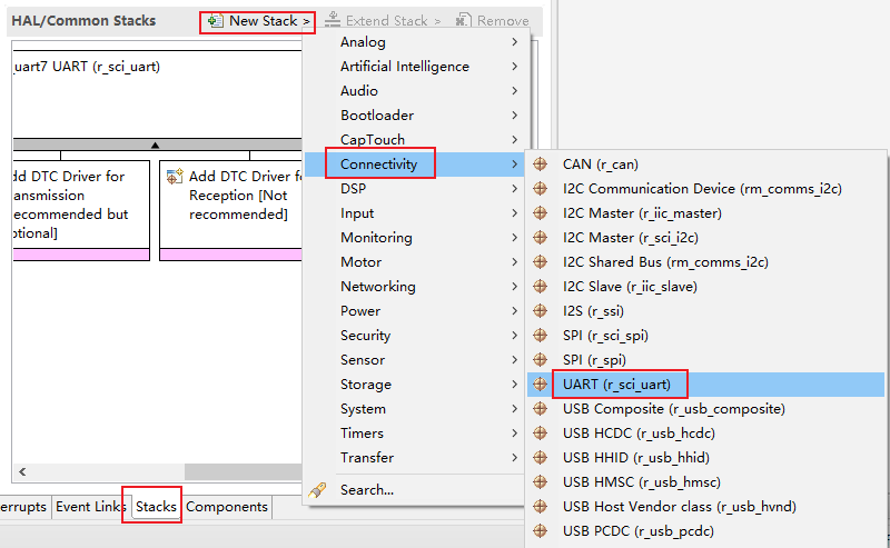 This section uses the example of adding on-chip peripheral drivers to explain how to add more drivers available to BSPs. If the on-chip peripherals you want to use are not available in the 'On-chip peripheral configuration menu', you need to add them yourself. Below we will demonstrate how to add a UART9 port for ra6m4-cpk.