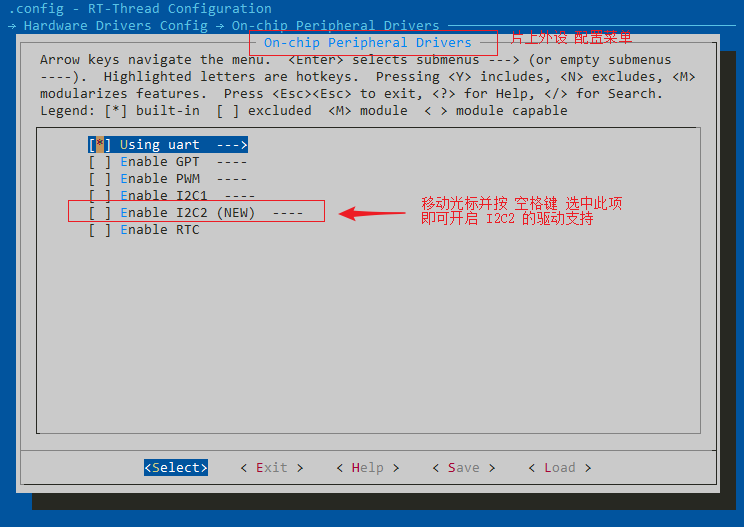 经过上一步的修改,此时重新打开 ENV 工具,在 menuconfig 中就会出现添加的 I2C2 的配置项。