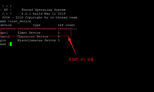 1. 查看结果,输入 list_device 命令,可以看到 gpt1 设备已经注册到内核,说明驱动已经添加成功。