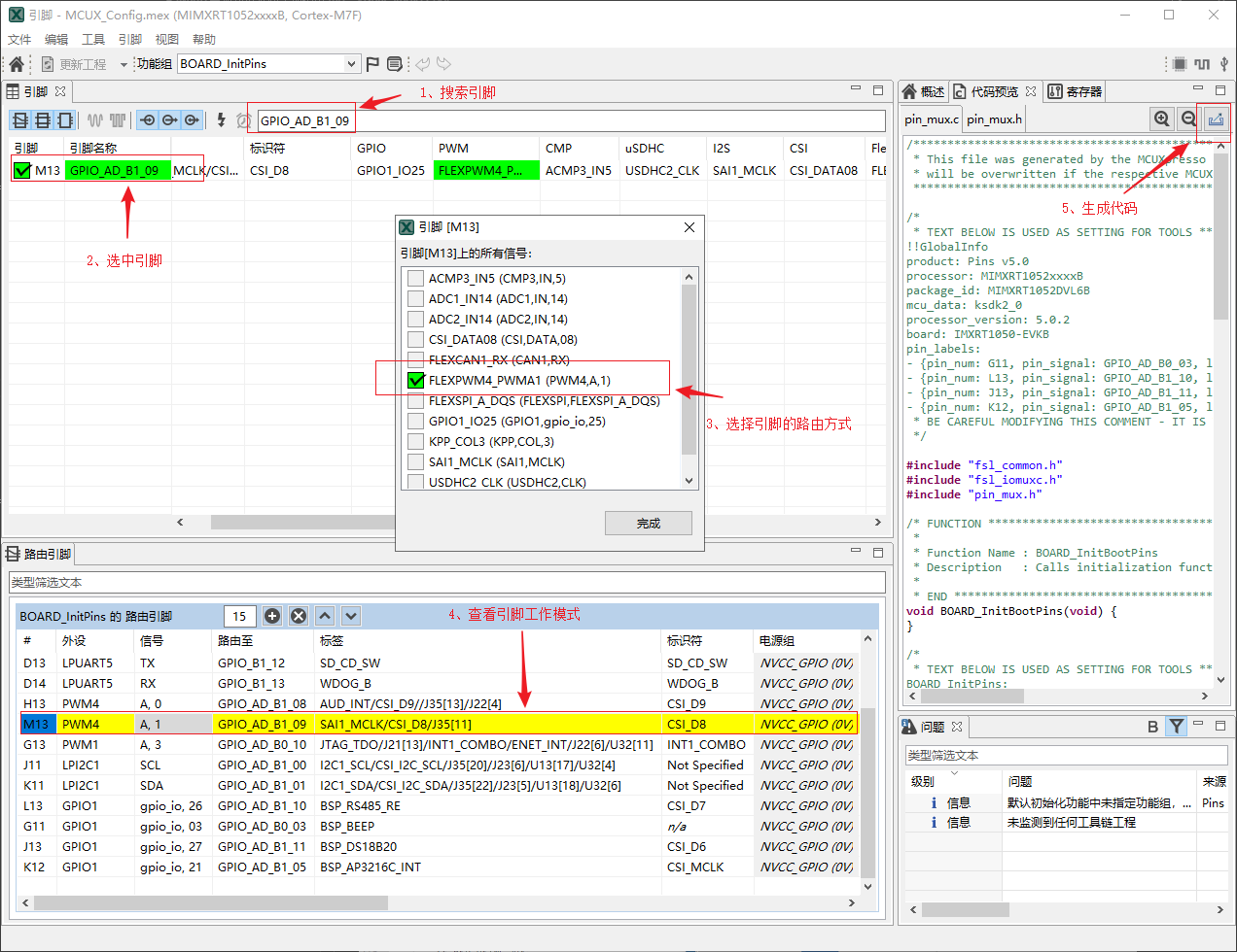 为 BSP 添加驱动时,MCUXpress工具可以快速的完成配置管脚的工作。而外设初始化,中断配置,DMA配置等等则由 RT-Thread 提供的驱动文件来完成。