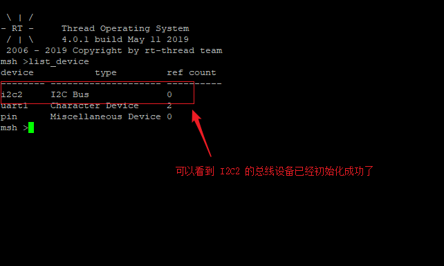 检查完工程后,编译下载到开发板,程序会自动开始运行。输入 list_device 命令,可以看到 I2C2 总线已经注册到内核,说明驱动已经添加成功。