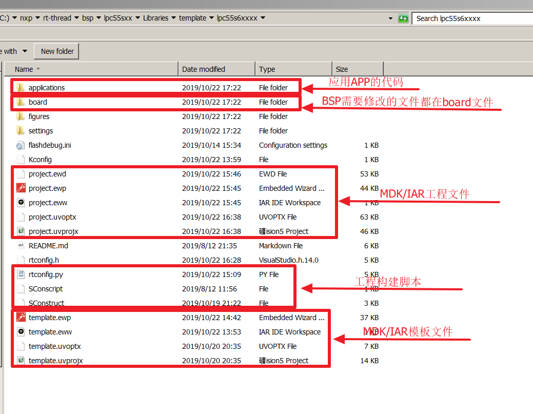 本次示例所用的 LPC55S6x 系列 BSP 模板文件夹结构如下所示: