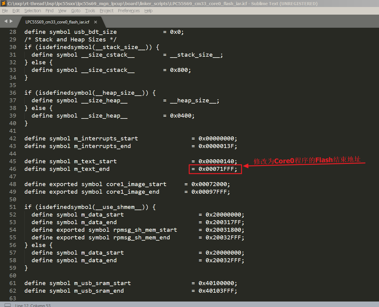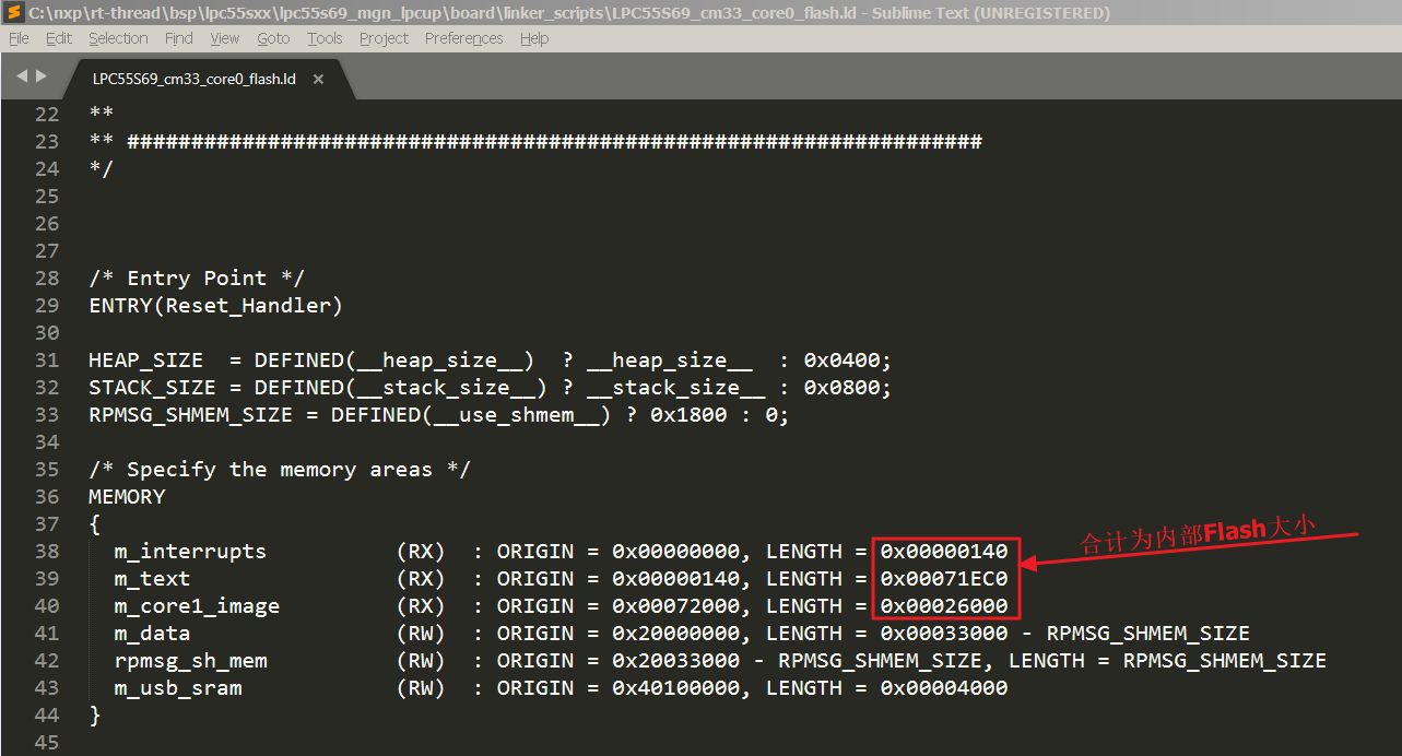 本次制作 BSP 使用的芯片为LPC55S69JBD100,片上FLASH 大小为 608kB,因为双核的关系,需要预留一部分空间给第二个内核,所以这里分给Core0的Flash大小为456KB,因此修 m_text_size 为 0x71E00。m_text_size、m_interrupts_size 和 m_core1_image_size 的大小合计为 608kB。