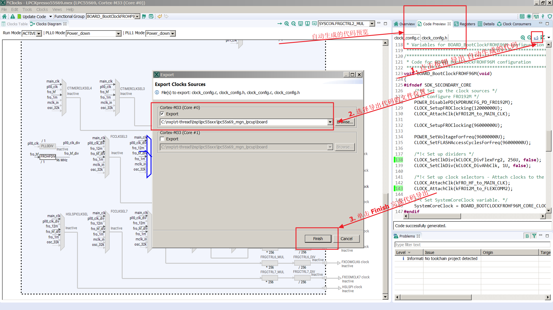 最终导出的pin_mux.c/pin_mux.h/clock_config.c/clock_config.h需要手动复制到BSP对应的board文件夹下(即上一级目录里),当然用户也可以手动修改Kconfig文件,修改pin_mux/clock_config的文件路径。