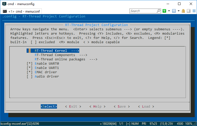 Type the menuconfig command in the Env terminal to enter the configuration interface, and then configure the BSP: