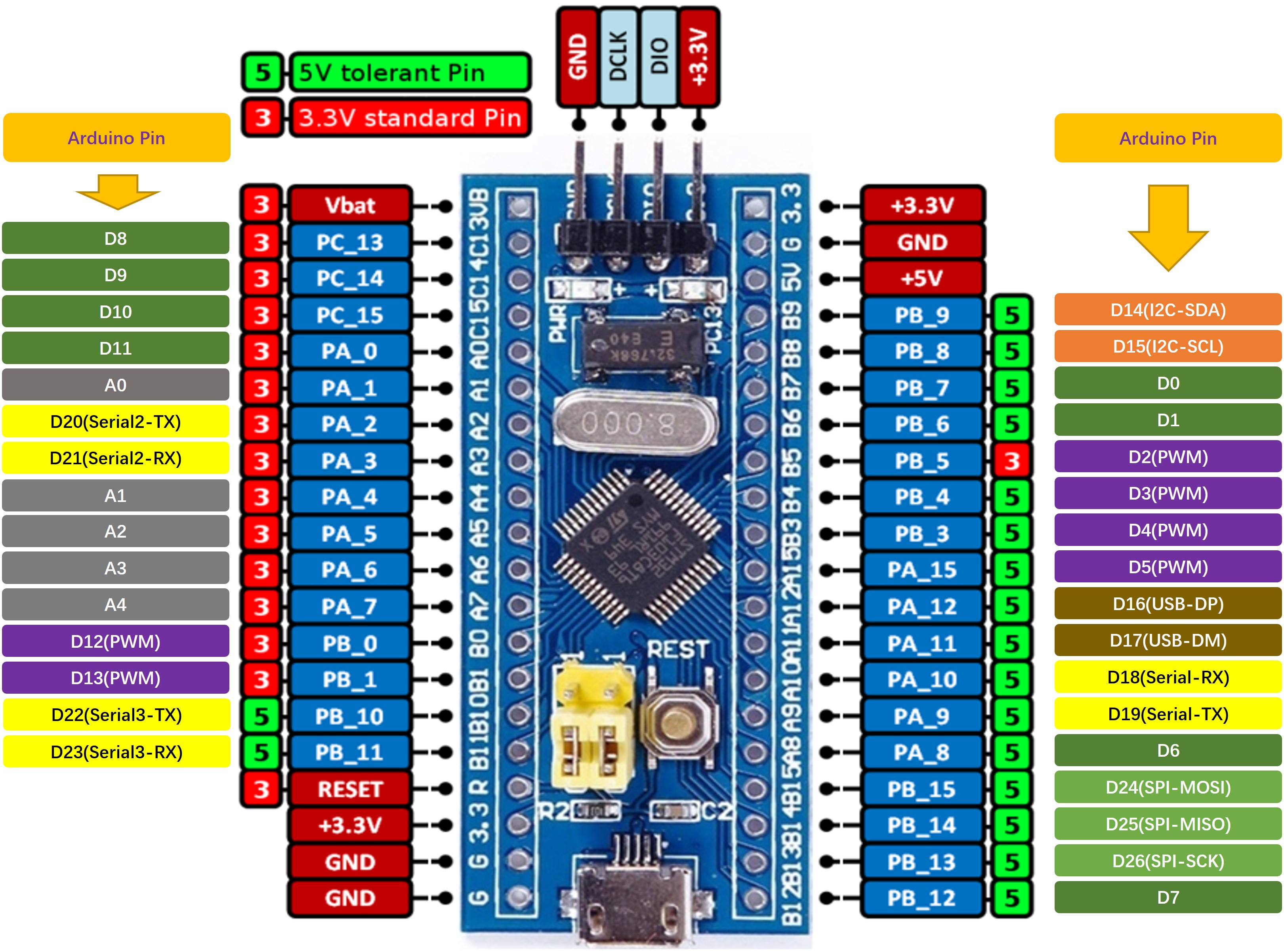 | Arduino Pin | STM32 Pin | 5V Tolerate | Note |