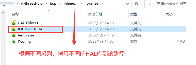 将以上文件拷贝至 BSP 的 libraries/IFX_PSOC6_HAL 文件夹下。(只有移植新的系列才需要做此步骤,同 PSOC6 系列无需此步骤)