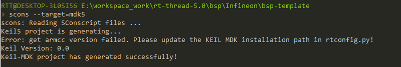 使用 env 工具输入命令 scons --target=mdk5 重新生成工程,如下图所示: