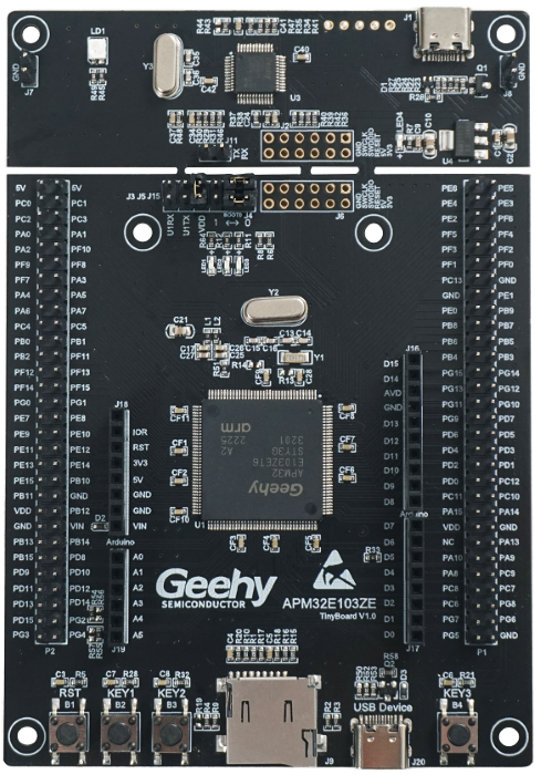 APM32E103ZE Tiny BOARD,采用标准JTAG/SWD调试接口,引出了全部的IO。开发板外观如下图所示: