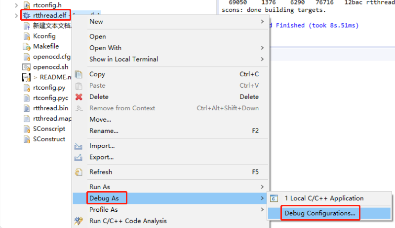 选中生成的 rtthread.elf 文件,右键配置 Debug 参数,如下图所示