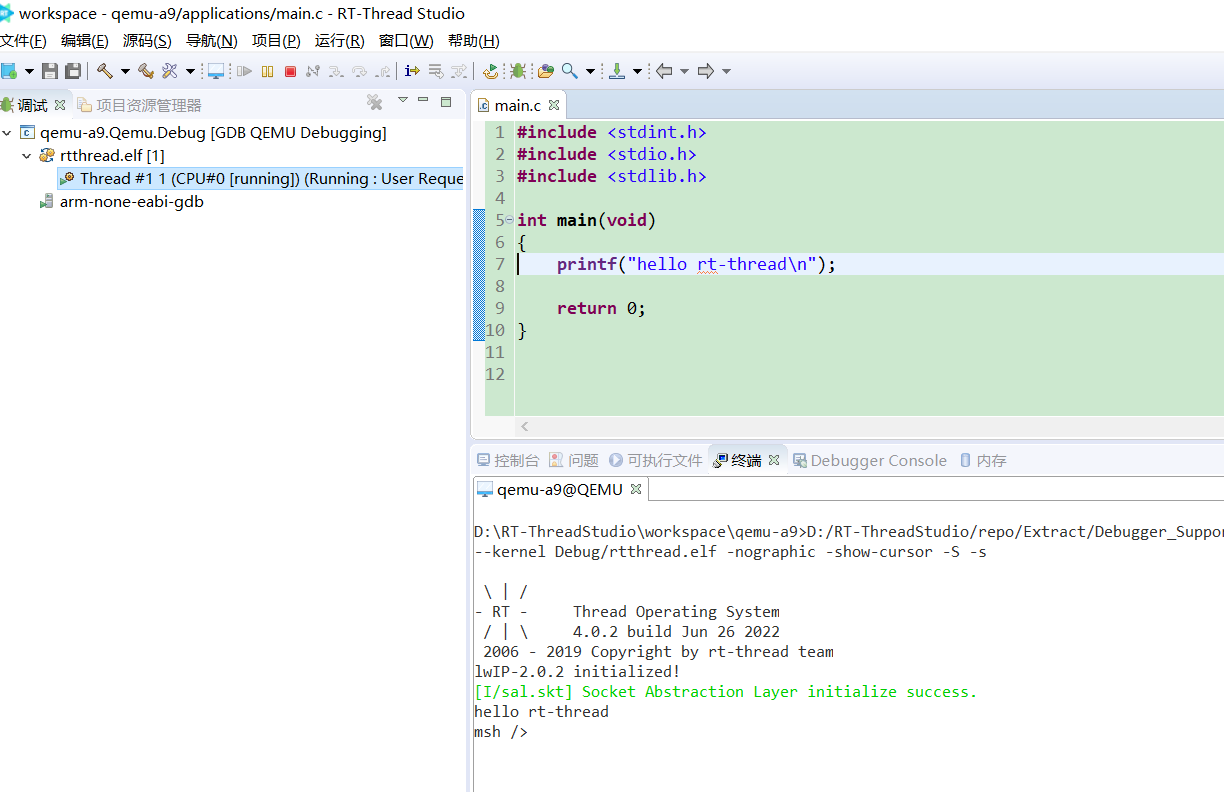 注意: 前面的错误信息可以忽略,能看到RT-Thread的启动logo输出,以及msh能正常输入输出,即可进行代码调试了。