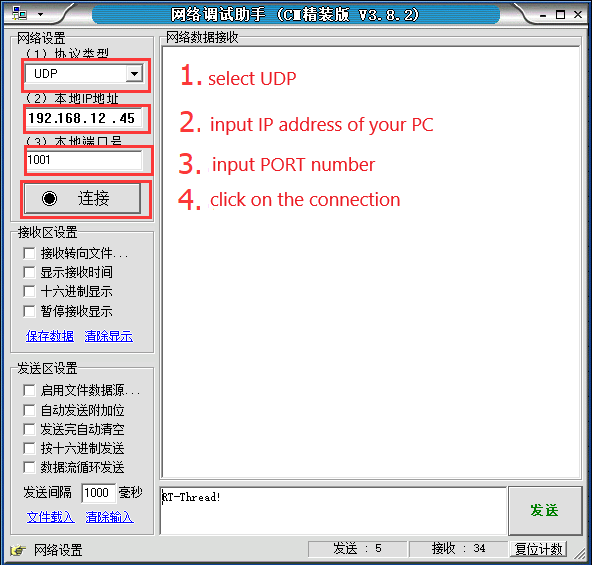 When running the example, first open a network debugging assistant on your computer and open a UDP server. Select the protocol type as UDP and fill in the local IP address and port 5000, as shown in the figure below.
