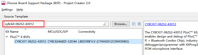 本节以制作 psoc6-cy8ckit-062S2-43012 开发板的 BSP 为例,讲解如何为一个新的开发板添加 BSP。