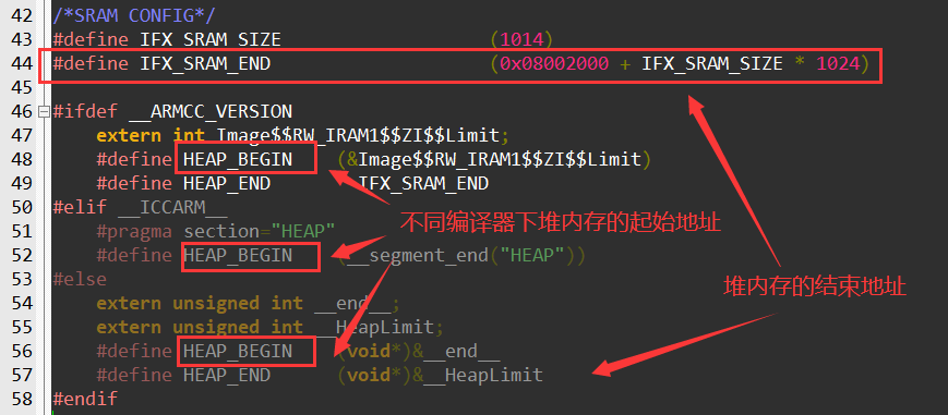 通常情况下,系统 RAM 中的一部分内存空间会被用作堆内存。下面代码的作用是,在不同编译器下规定堆内存的起始地址 HEAP_BEGIN 和结束地址 HEAP_END。这里 HEAP_BEGIN 和 HEAP_END 的值需要和后面 3.5.1 修改链接脚本 章节所修改的配置相一致。
