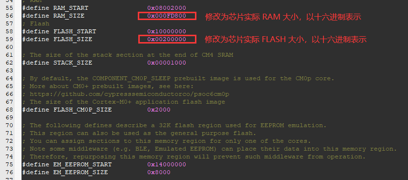 本次制作 BSP 使用的芯片为 CY8CKIT-062S2-43012 ,FLASH 为 2M,因此修改 FLASH_SIZE 的参数为 0x00020000。RAM 的大小为 1M, 因此修改 RAM_SIZE 的参数为 0x000FD800。修改链接脚本时,可以参考 3.2.1 堆内存配置讲解 章节来确定 BSP 的内存分配。