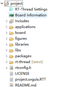 导入成功后,文件资源管理器窗口中会显示如下结构,其中 RT-Thread Settings 为图形化工程配置文件,双击打开即可。