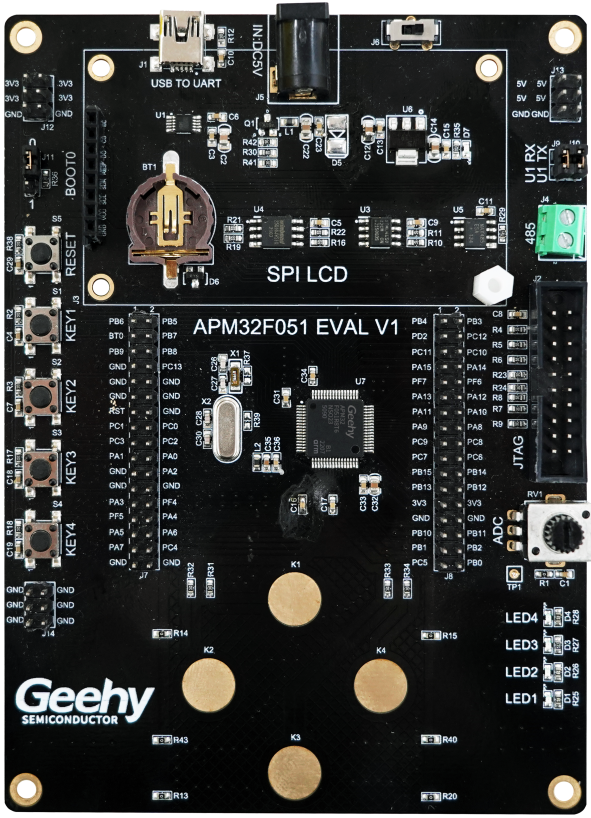 APM32F051R8 EVAL BOARD,采用标准JTAG/SWD调试接口,引出了全部的IO。开发板外观如下图所示: