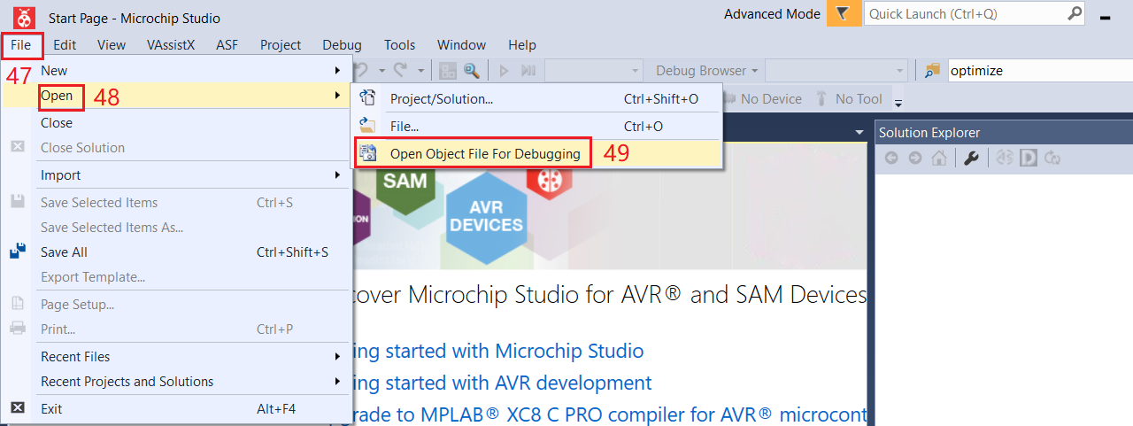 Open installed Microchip Studio 7 and open object file for debugging.