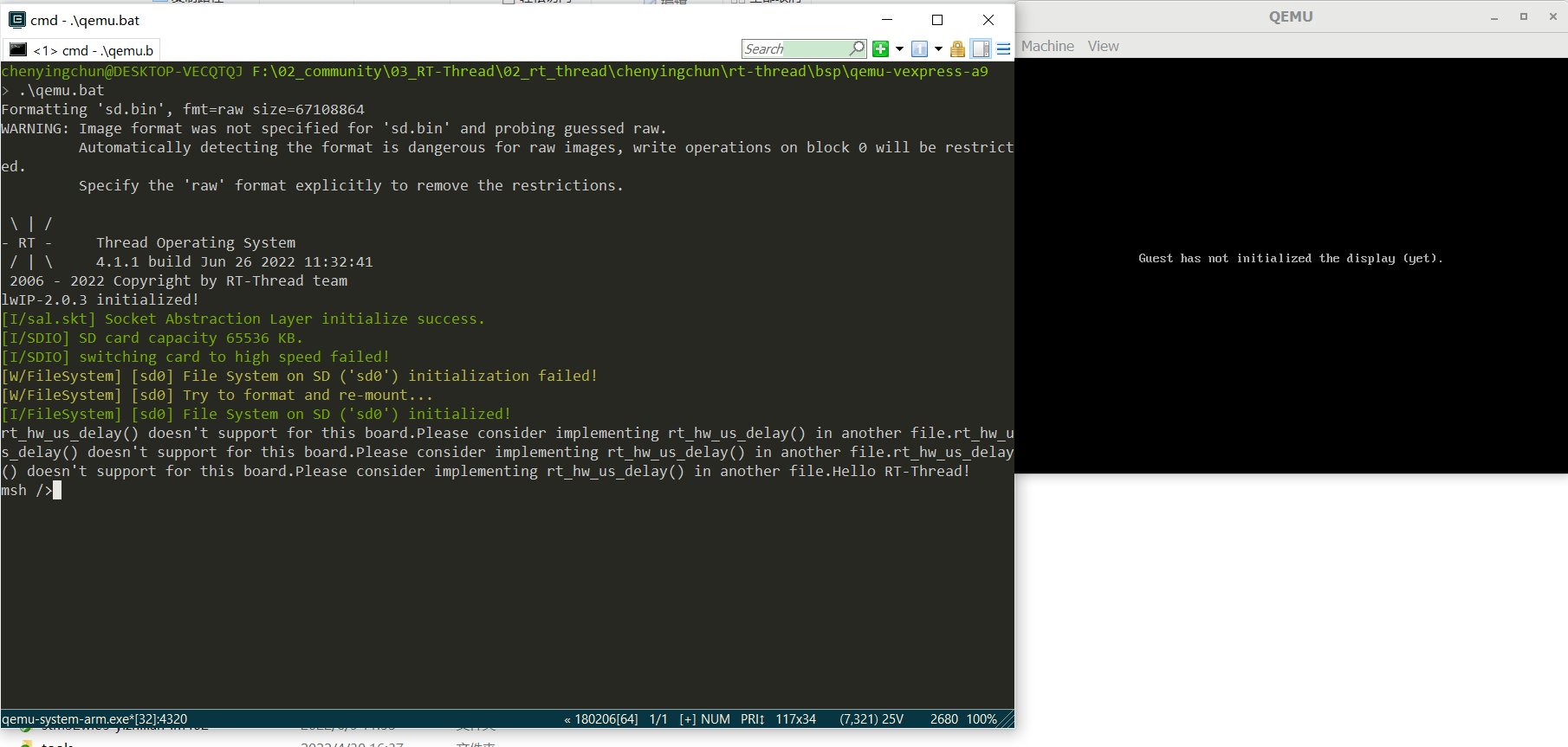 当要运行编译好的RT-Thread时,可以在bsp目录下运行env,在env中敲入qemu.bat即可直接运行。这个执行脚本默认把串口输出到stdio(即控制台)上,所以直接执行脚本后就可以输出结果了。