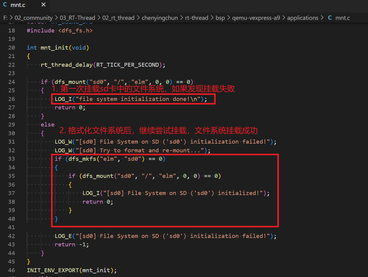 注意一下,默认情况下,由于SD中没有文件系统存在,因此挂载失败,程序中检测到文件系统挂载失败后,会自动执行mkfs对文件系统进行格式化操作,格式化完后,再次执行mount操作,文件系统挂载成功