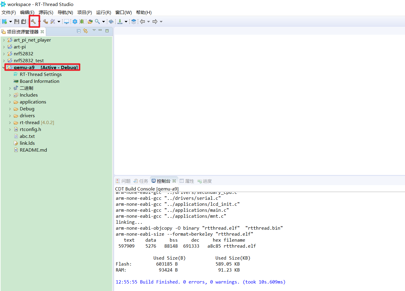 注意: 前面的错误信息可以忽略,能看到RT-Thread的启动logo输出,以及msh能正常输入输出,即可进行代码调试了。