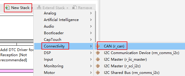 - 创建 stack 并进入配置。因为需要适配 RT-Thread 驱动中使用的命名,所以需要修改命名,设置 name 、channel 为一致的标号,callback统一命名为