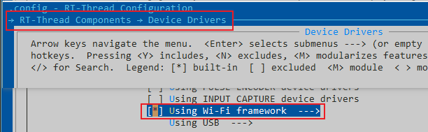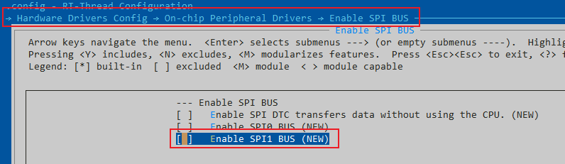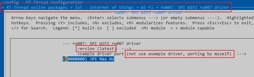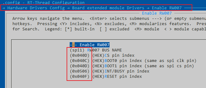 - menuconfig 中打开驱动的 RW007 配置,默认使用了 SPI1 端口。所以需要打开 SPI1 总线。