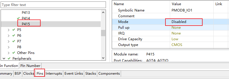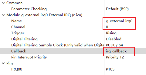 - 选择引脚编号,进入配置,比如选择 P105 做为中断引脚。可先找到引脚查看可配置成的 IRQx 通道号。