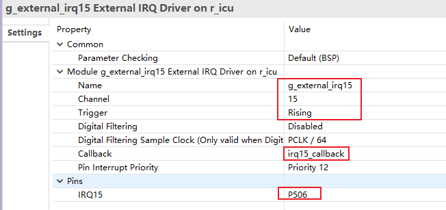 - RW007 有一个从机控制的 INT 引脚,需要占用一个 IRQ 通道,下图以 P506 为例的配置如下: