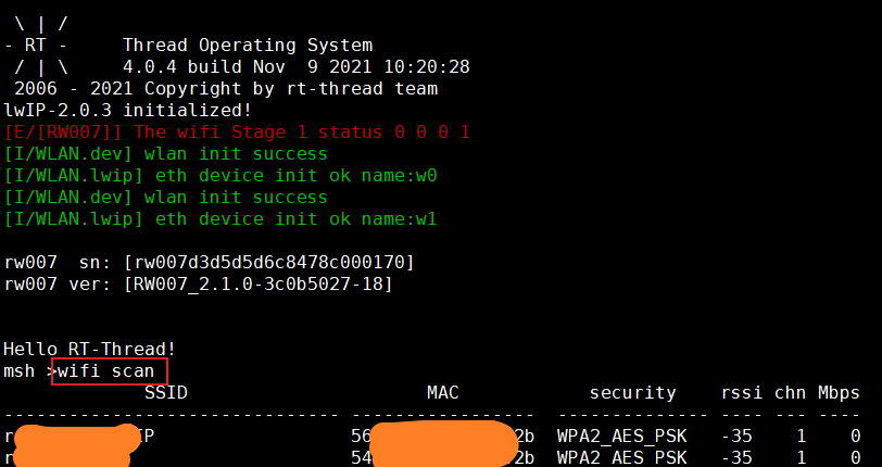 系统启动会自动获取 RW007 的信息,输入wifi scan 命令扫描环境中的 WiFi 信号。更多 WiFi 命令