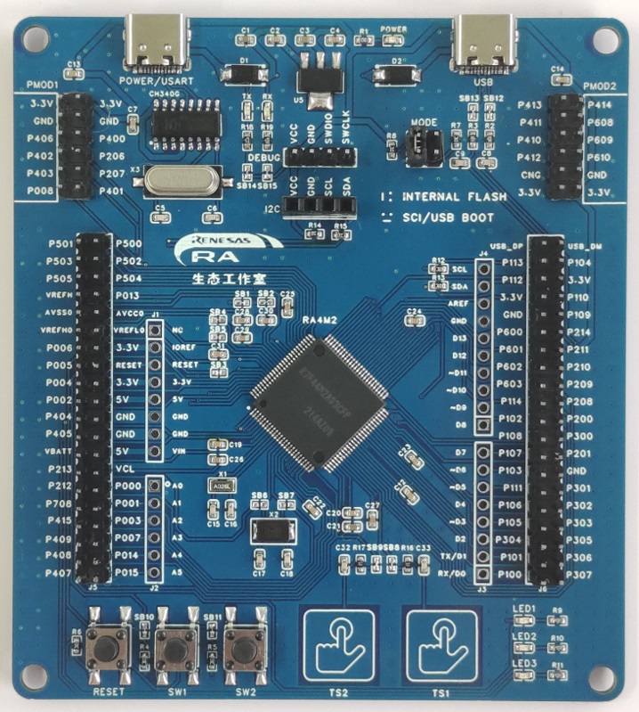 基于瑞萨 RA4M2 MCU 开发的 RA-Eco-RA4M2-100PIN 评估板,通过灵活配置软件包和 IDE,可帮助用户对 RA4M2 MCU 群组的特性轻松进行评估,并对嵌入系统应用程序进行开发。