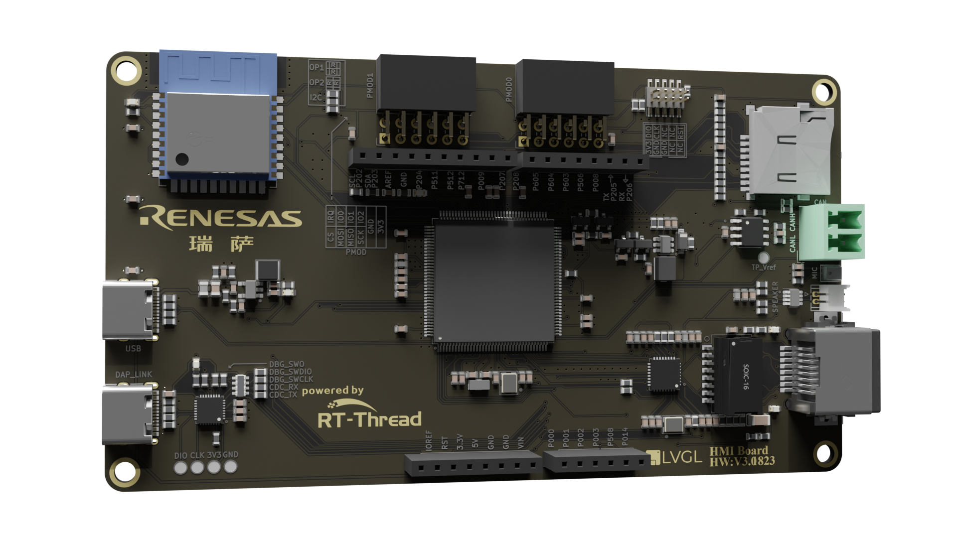 Let’s start with an introduction to the development board. The HMI-Board board, built on the foundation of the Renesas RA6M3 MCU, is a game-changer. With its flexible software package and IDE configuration, users can easily evaluate the features of the RA6M3 MCU group and develop cutting-edge embedded system applications.