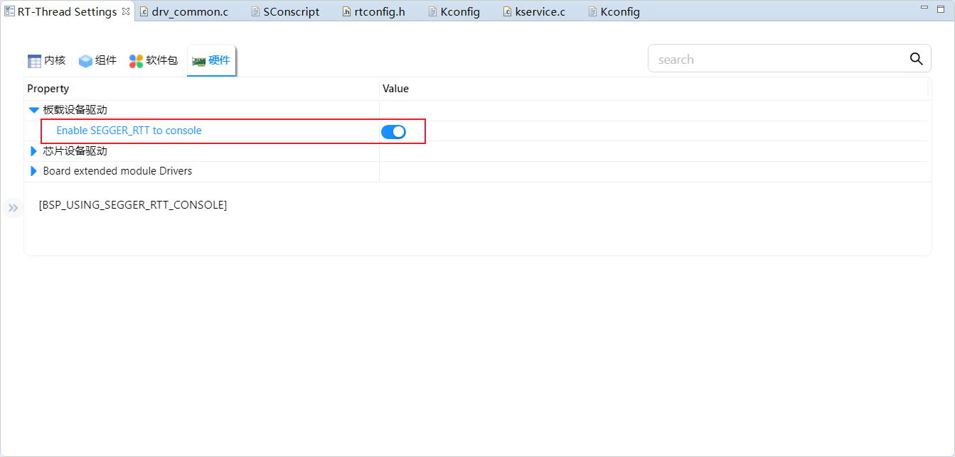 由于瑞萨RA6M4的串口使用需要使用USB转TTL工具,使用起来十分不方便,RT-Thread提供的RTTHREAD_SEGGER_TOOL软件包可以将J-Link作为RT-Thread的console口来使用,用户在RT-Thread Settings->硬件->板载设备驱动下使能SEGGER-RTT即可,如下