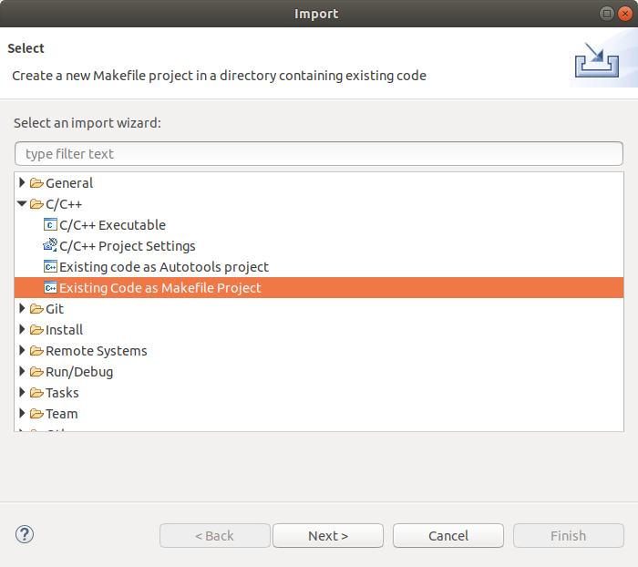 点击菜单栏左上角 File -> Import...,展开 C/C++ ,选择 Existing Code as Makefile Project ,点击 Next 继续。