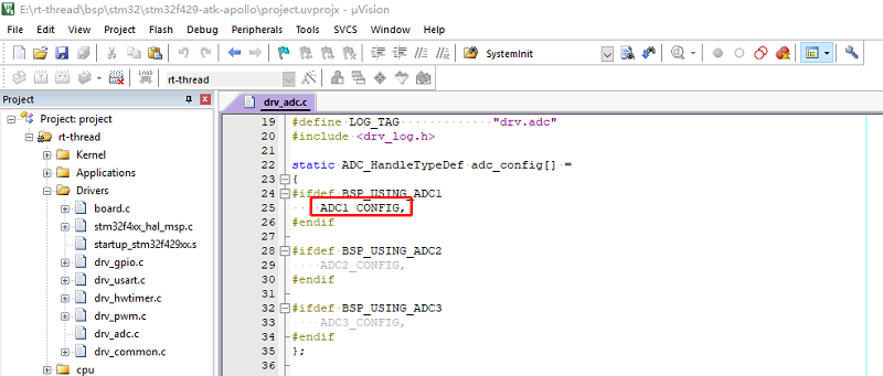 本章节以添加片上外设驱动为例,讲解如何为 BSP 添加更多可用驱动。如果想使用的片上外设是 片上外设配置菜单 里没有的,就需要开发者自己添加了。下面我们将演示如何为 stm32f429-atk-apollo BSP 添加 SPI3 驱动。