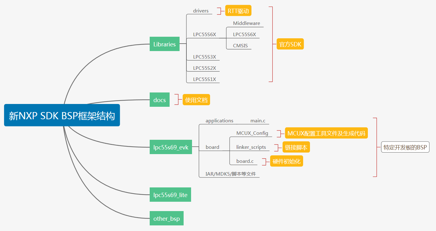 | 项目 | 文件夹 | 说明 | | - | - | :-- | | 官方 SDK | lpc55sxx/libraries/LPC55S69 | LPC55S69系列官方 SDK | | drivers | lpc55sxx/libraries/drivers | LPC55Sxx 系列通用 RTT 驱动 | | 特定开发板 BSP | lpc55sxx/lpc55s69_evk | NXP 官方 LPCXpressp55S69 EVK 开发板 BSP |