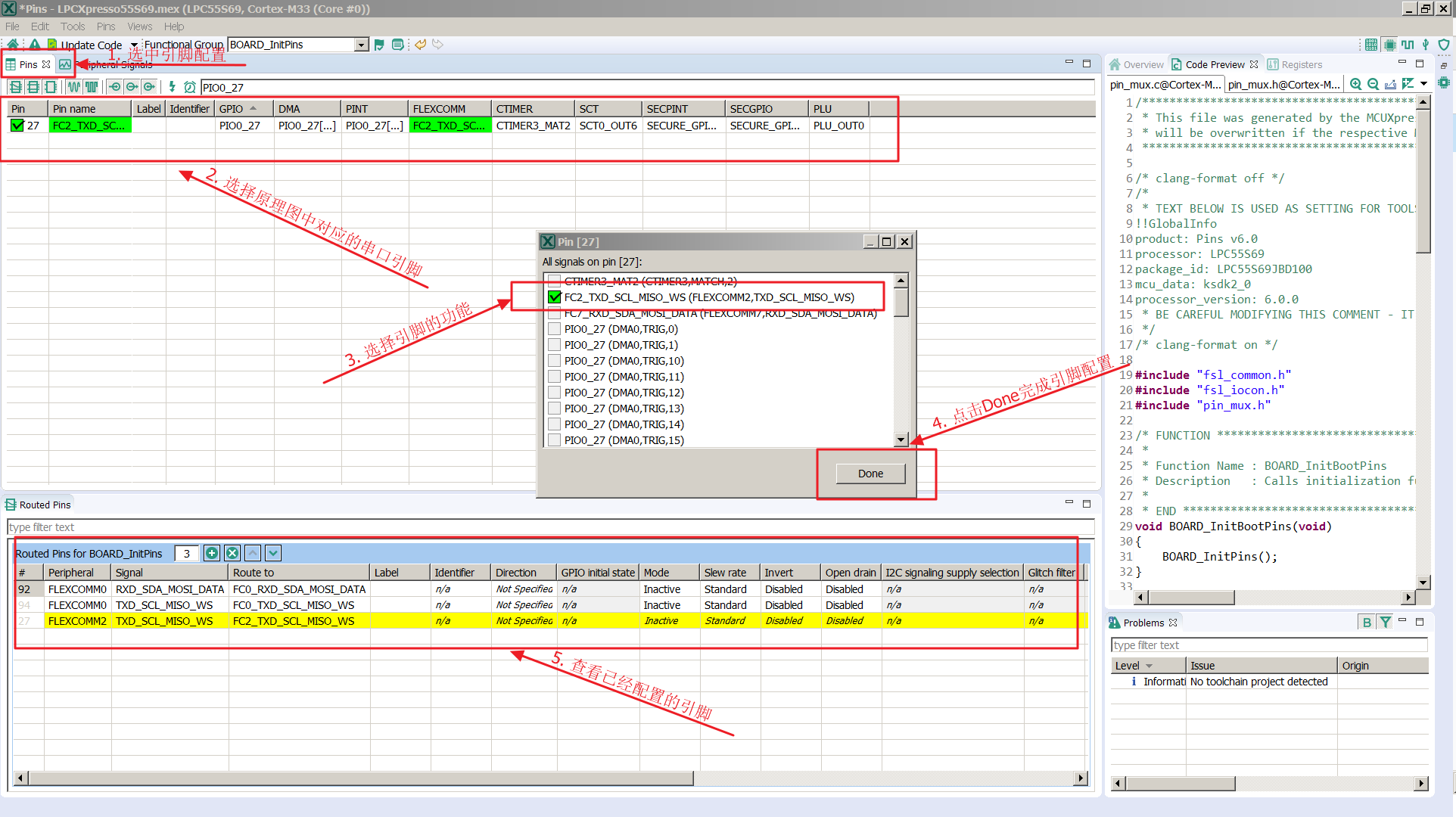 使用 MCUXpresso 工具的一个好处就是可以图形化的配置引脚,不同子系列的芯片外设之间的区别一般是使用的引脚不一样,使用 RT-Thread 外设驱动的第一步就是需要配置外设对应的引脚,而外设的初始化不需要使用工具配置,这个过程在 RT-Thread 外设驱动中完成。